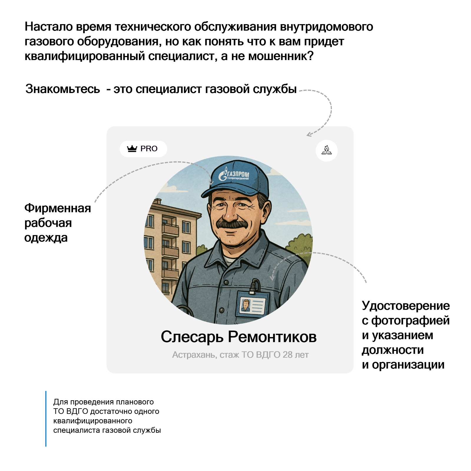 Ежегодное техническое обслуживание внутридомового газового оборудования — это один из инструментов обеспечения безопасности. Но как отличить настоящих специалистов от мошенников? Филиал АО «Газпром газораспределение» подготовило наглядную информацию в карточках.
